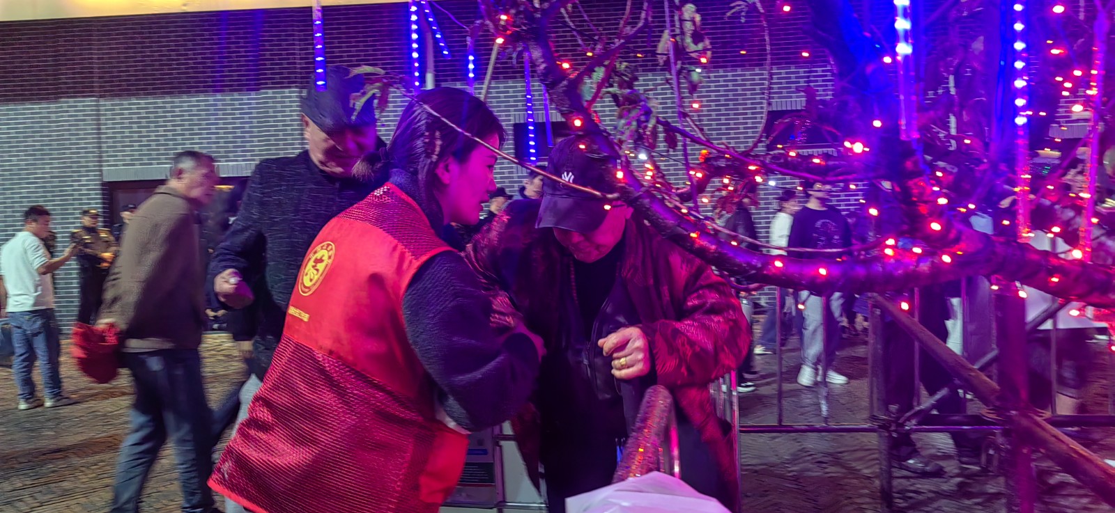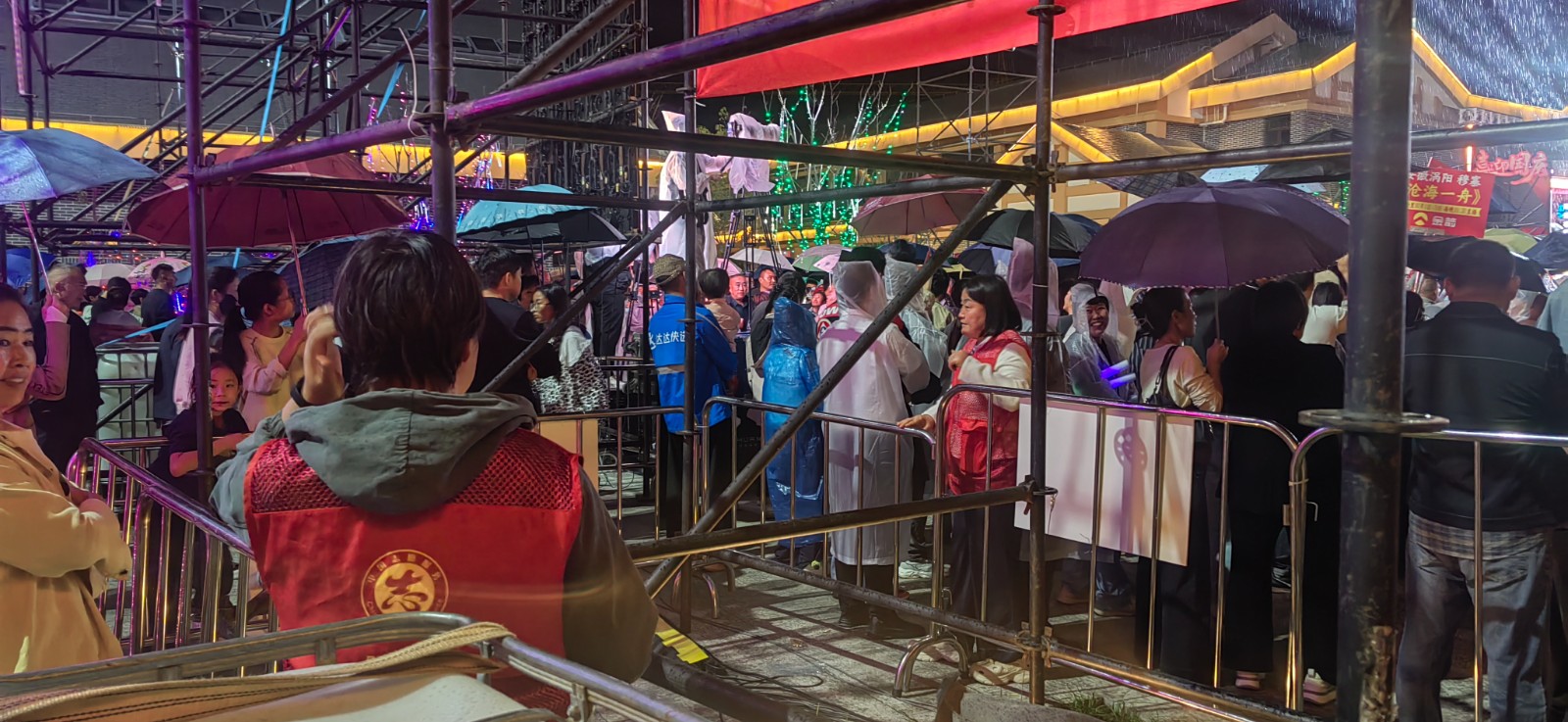 此次志愿服务的核心任务明确聚焦于关键设备看护:志愿者们需重点守护两座灯光投射高架、一处大屏播放架,同时严密看管周边防护栏杆及配套水箱,严防群众因好奇或拥挤发生踩踏、碰撞设备等安全事故。活动期间,天气格外“考验”人,雨虽不大却下得密集,且时断时续,细密的雨丝落在身上,不消片刻就能浸湿衣裤。志愿者们冒雨实行“分片包干、定点值守”模式,每人负责特定设备区域。即便雨水模糊了视线,他们也只是快速抹一把脸,继续耐心劝阻靠近栏杆的市民,主动引导人流绕行,用“雨天不缺位”的坚守,守住了设备与市民的双重安全。