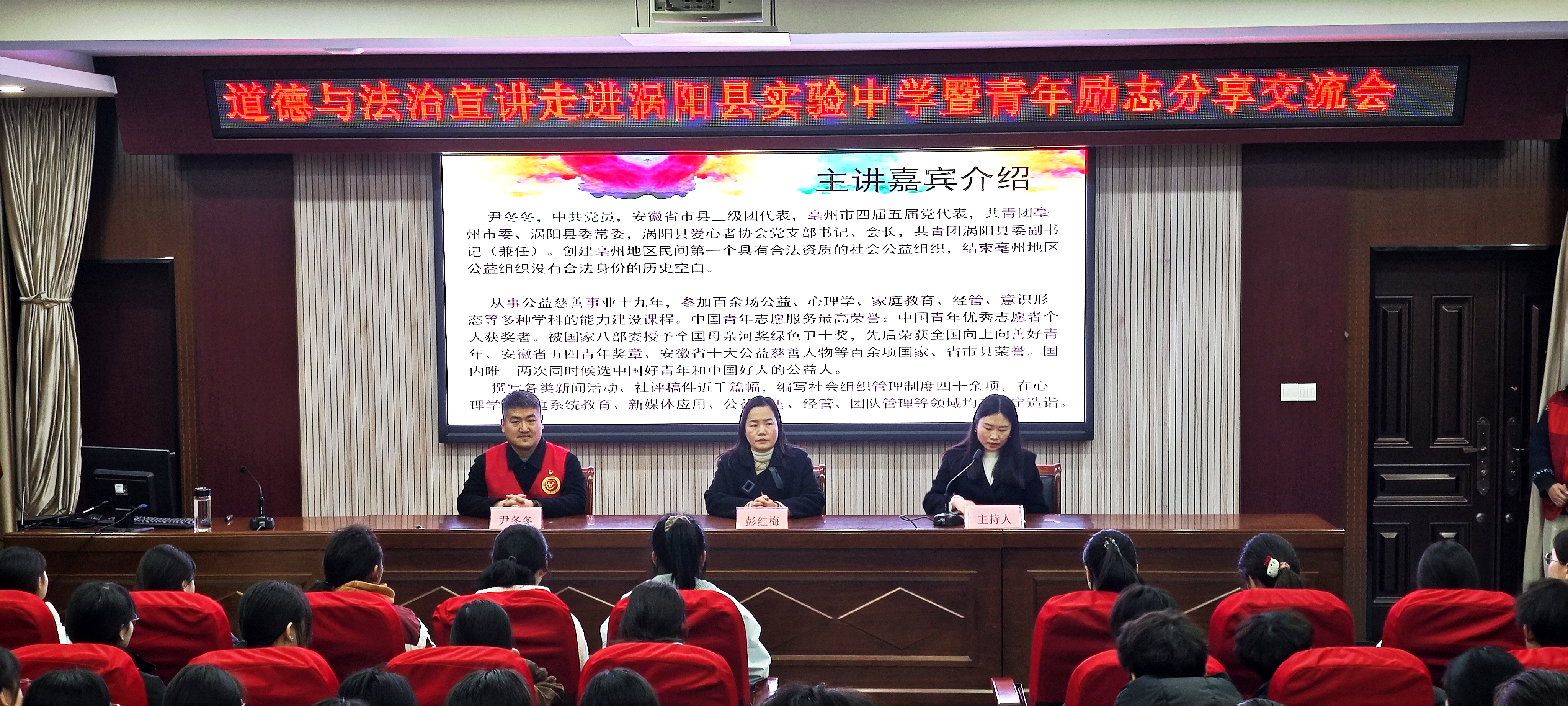 奋斗的青春最美丽:道德与法…奋斗的青春最美丽:道德与法治青年交流会走进校园为深入贯彻落实青少年思想道德建设要求,引导广大青少年树立正确的世界观,人生观,价值观,扣好“人生第一粒扣子”,在团涡阳县委的指导下,涡阳县爱心者协会联合涡阳县实验中学特邀请亳州市四届、五届党代表、亳州市优秀青年宣讲团成员、团涡阳县委兼职副书记、涡阳县爱心…