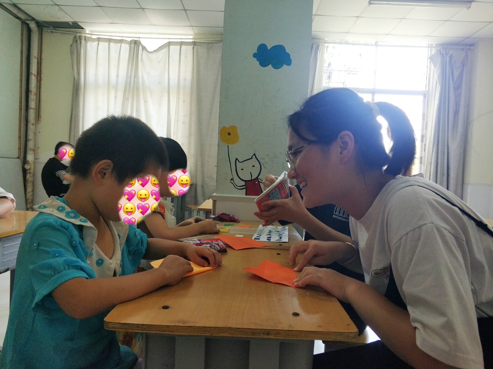 在活动现场,大家伙分工明确,三五成群,热闹而秩序井然。为了拉近与福利院儿童们的距离,活动前进行了周密的策划,分为谈心交流、同做手工、游戏相伴等环节。通过谈心交流大家逐渐敞开心扉,彼此增进了了解和信任。在同做手工环节,志愿者们起初一对一的与服务对象做手工,随后又聚在一起,分享大家的手工成果,通过短暂的磨合,大家的关心更进一步。随后大家有的做游戏,有的下象棋,玩的忘乎所以却又不时开怀大笑。